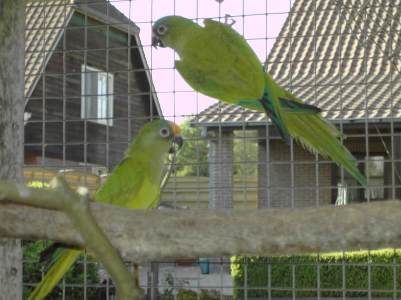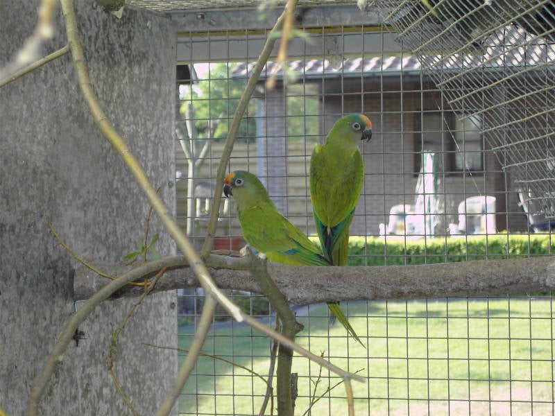 De goudvoorhoofdparkieten zijn bij mijn ervaring het minst luidruchtig en ook het knagen valt erg mee. Ook in de buitenvoliere voelen ze zich goed, als ze maar de beschikking hebben over een vorstvrij nachthok. Zie foto´s hieronder: